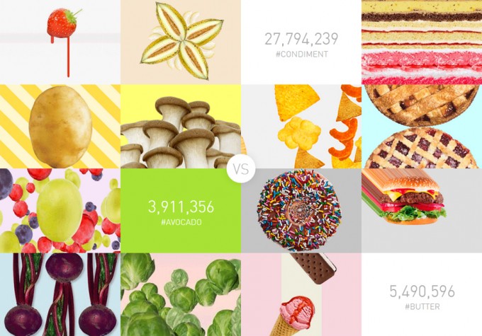 Accediendo a este índice, nos aparece una pantalla con 24 casillas con una cifra que fluctua constantemente, ya que va recopilando información sobre las veces que se utilizan los hashtags considerados saludables y los considerados no saludables. Zanahorias, patatas, brócoli, granadas, fresas, postres, mantequilla, hamburguesas, pizza, snacks, bacon, etc. En total se muestran dos grupos de hashtags de 12 casillas con alimentos saludables y no saludables. Pulsando sobre cada casilla podemos ver el número de veces que se ha empleado el hashtag correspondiente, así como la suma de nuevos usuarios que lo están utilizando.