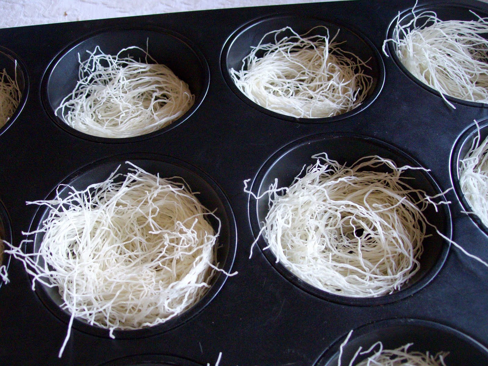 La Pasta kataifi tiene su origen en Grecia y es empleada principalmente en la elaboración de dulces y postres, pero da un magnifico resultado para la presentacion de platos salados. De textura crujiente y fina, permite hacer nidos, madejas, cilindros y capas que se frien y dan volumen al plato al tiempo que pone el contrapunto con una textura tierna y crujiente.Dado que la pasta es muy fina, no necesita mucho tiempo expuesta al calor. Elaboramos una madeja con la pasta y ayudados por un molde o un cazo de servir sopa, metemos la pasta unos segundos en la freidora y en cuanto se dore, sacamos y dejamos sobre papel absorvente.